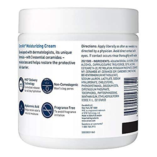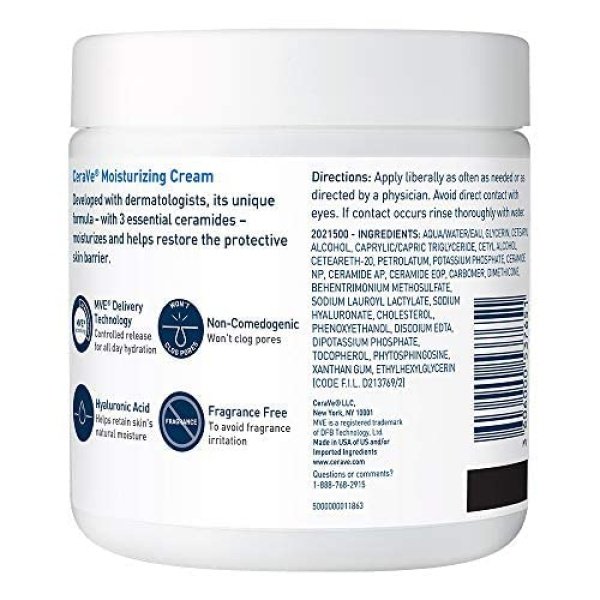 Details: Developed with dermatologists, CeraVe Moisturizing Cream has a unique formula that provides 24-hour hydration and helps restore the protective skin barrier with three essential ceramides (1,3,6-II) and hyaluronic acid. This rich, non-greasy, fast-absorbing formula is ideal for sensitive skin on both the face and body Featuring our patented MVE Technology to release a steady stream of moisturizing ingredients throughout the day and night.