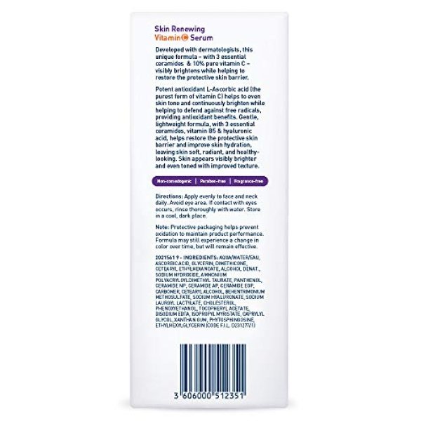 Details: Developed with dermatologists, CeraVe Vitamin C Serum visibly brightens & helps to restore the protective skin barrier. Potent antioxidant L-Ascorbic acid (the purest form of vitamin C) helps to even skin tone & continuously brighten while helping to defend against free radicals & provide antioxidant benefits. Gentle, lightweight formula helps restore the protective skin barrier & improve hydration, leaving skin soft, radiant, & healthy-looking. Paraben-Free Fragrance-Free Non-Comedogenic