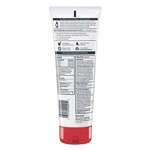 Details: Eucerin Daily Hydration Cream SPF 30 provides 24 hour moisture to dry skin while protecting it from sunburn and long-term skin damage with Broad Spectrum UVA/UVB protection. UV light is the main cause of sun-induced skin damage and a major risk factor for most skin cancers. This fast-absorbing skin cream for dry skin is non-greasy, and is enriched with Pro-Vitamin B5 and Sunflower Oil. This Eucerin body cream for dry skin is a lightweight 2 in 1 moisturizer and Broad Spectrum sunscreen that is fragrance free and dye free, and is safe for sensitive skin. This body moisturizer is perfect for those looking for a dry skin body cream that also helps protect skin from sunburn and long-term skin damage when used as directed. For sunscreen use, apply this Eucerin sunscreen cream liberally 15 minutes before sun exposure. Use a water resistant sunscreen if swimming or sweating. Reapply at least every 2 hours. Eucerin is a dermatologist-recommended skincare brand that is based on an uncompromising approach to science. With skin care products designed to restore and sustain healthy-looking skin, families everywhere look to Eucerin to enhance outer beauty and self-confidence.