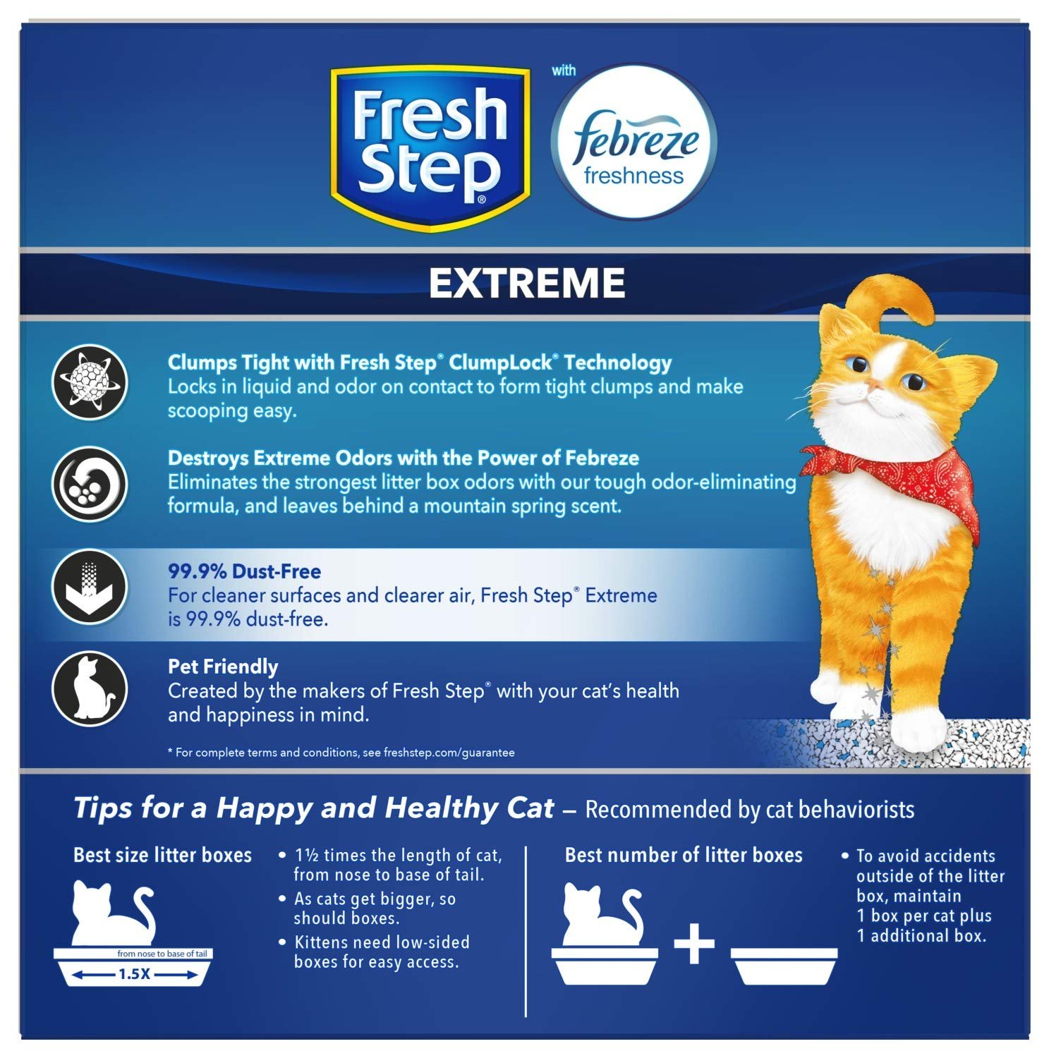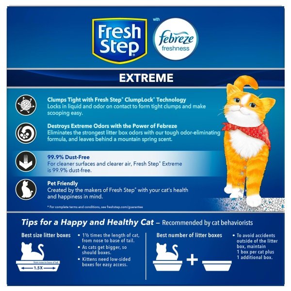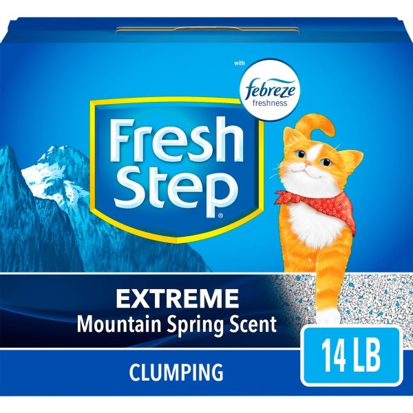 Fresh Step Extreme Clumping Cat Litter is formulated with the power of Febreze in Mountain Spring scent to destroy extreme litter box odors. This 99.9% dust free litter formula with Ammonia Block Technology, controls the growth of bacterial odors and blocks urine odors, as it leaves behind a Mountain Spring scent. The paw activated fragrance releases every time your cat uses the litter box, providing odor control as needed without being overpowering. ClumpLock technology in this litter quickly absorbs liquids while trapping odors on contact to form tight clumps and makes scooping fast and easy. Made with a pet friendly formula, this cat litter helps keep surfaces cleaner and air clearer with your cats health and happiness in mind. To refresh your litter box, add more Fresh Step scented cat litter. Keep your cat paws and floors purrfectly clean with this 99.9% dust free formula. Certain trademarks used under license from Procter & Gamble Company or its affiliates.