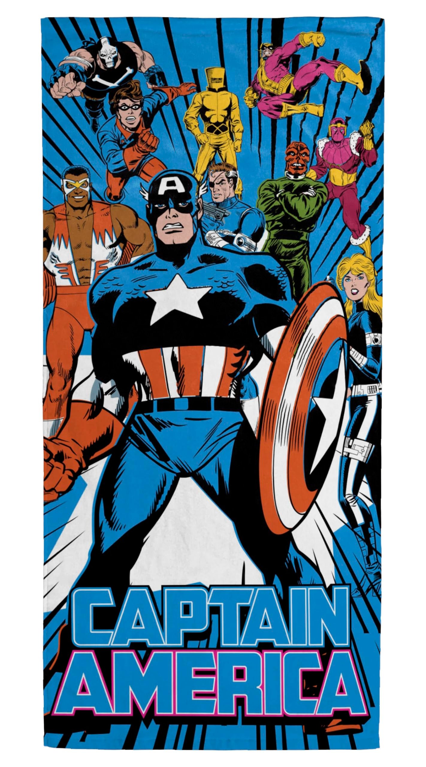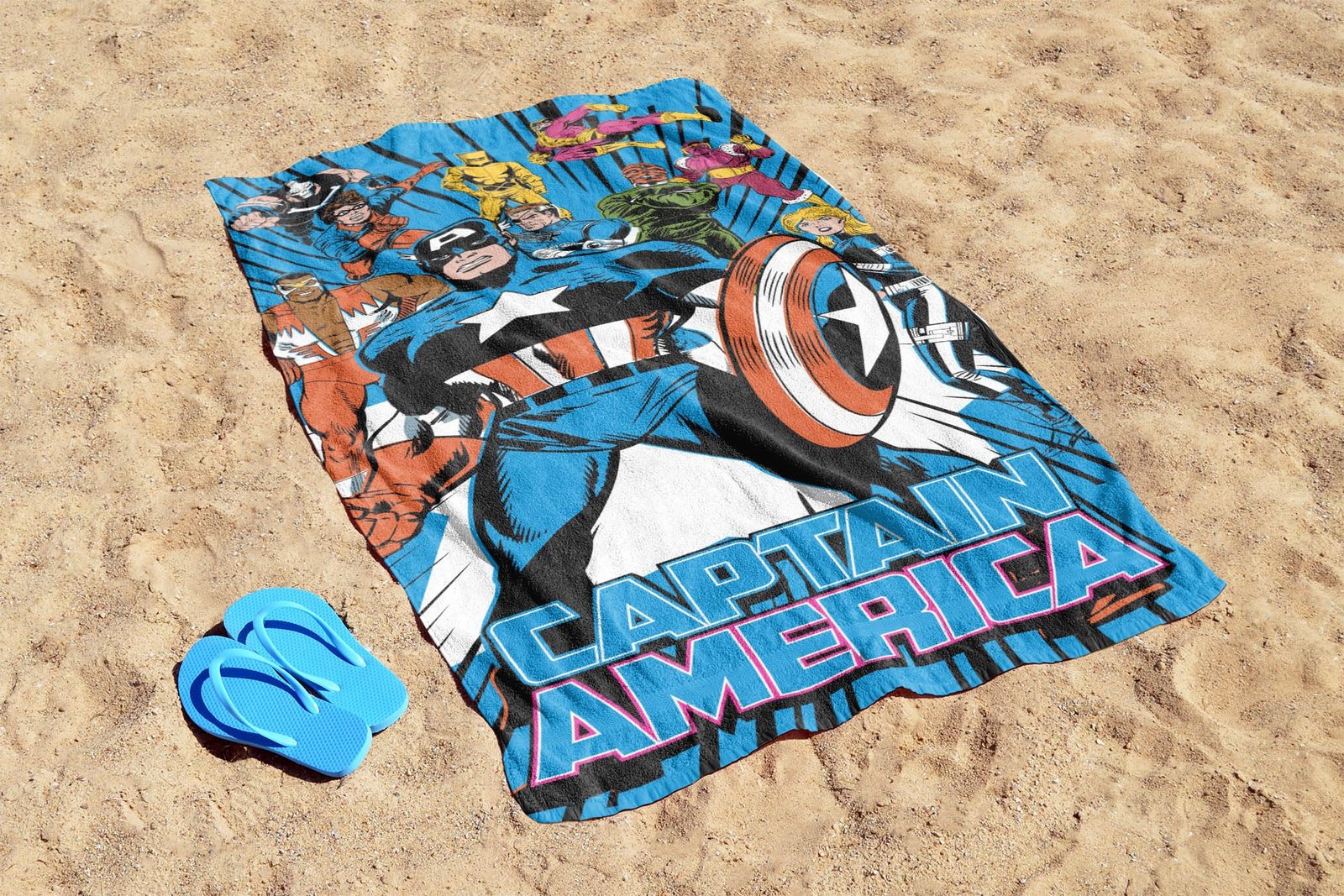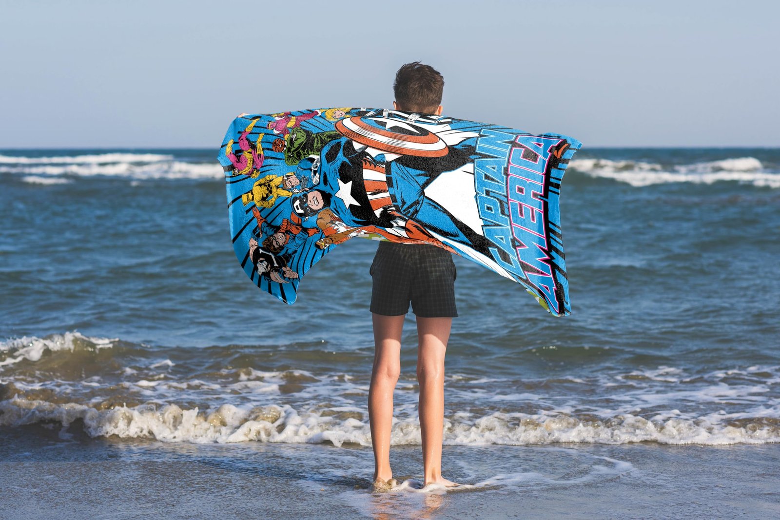 Turn up the fun in the sun with the Marvel Comics Captain America beach towel! Super soft & absorbent, this beach towel is made from 100% cotton terry ensuring softness and comfort. The breathable fabric allows for absorbency while also being comfortable to touch. Give your little one the chance to sprawl out on the beach in style! Your child will be looking forward to beach and pool days, and even bath time with their favorite towel featuring their favorite Avenger!
