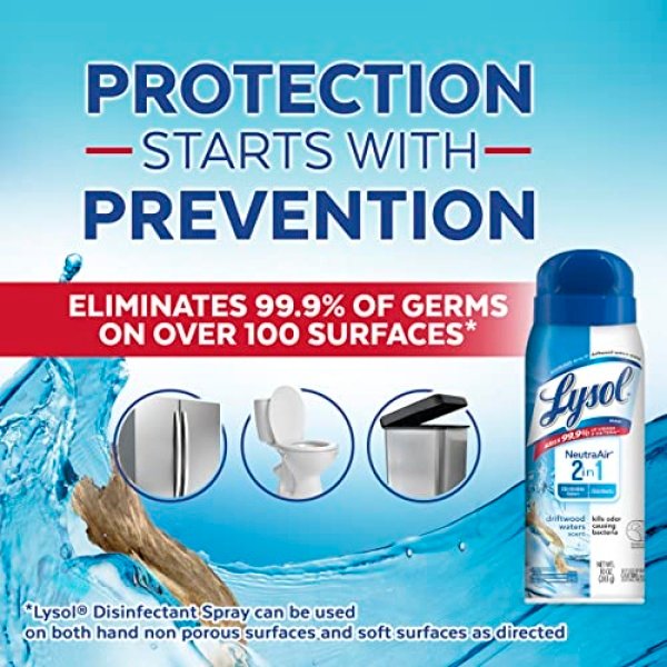 Details: The new Lysol Disinfectant Spray 2 in 1 combines effective germ killing and odor elimination. This product is Designed to provide germ protection and can kill 99.9 percent of viruses and bacteria on hard surfaces, when used as directed. It kills 99.9 percent of the odor causing bacteria at the source and leaves an incredibly fresh scent in the air. It is perfect for usage all around the home, eliminating even the toughest odors in the bathroom, kitchen, around garbage cans and others. This spray eliminates odors and prevents mildew and mold on most household surfaces. Sanitizes soft surfaces and deodorizes the air. The Driftwood waters scent is a crafted Fusion of invigorating watery marine notes paired with a hint of aromatic woods.