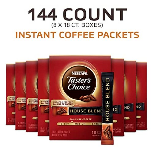 NESCAFE Taster’s Choice, House Blend Light Medium Roast Instant Coffee, 8 boxes (144 Packets)