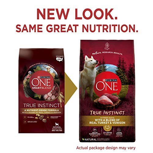 Give your dog the taste he craves with Purina ONE True Instinct With a Blend Of Real Turkey and Venison adult natural dry dog food with added vitamins, minerals and nutrients. With 100 percent nutrition and 0 percent fillers, every ingredient in this Purina dog food has a purpose. We start our high protein dog food recipe with real turkey as the number 1 ingredient and include real venison. They help to deliver 30 percent protein, which helps support your active dog’s strong muscles. We also craft our high quality dog food with added vitamins, minerals and nutrients and with no poultry by-product meal or artificial flavors or preservatives. This recipe also features natural sources of glucosamine to support joint health for dogs. A crunchy kibble texture and added calcium helps support his strong teeth and healthy gums. With natural nutrition backed by research and crafted by a veterinarian-recommended brand, Purina ONE True Instinct With Real Turkey and Venison dog food keeps you and your dog happy.,Purina ONE is produced in U.S. facilities where we take steps to make it good for your dog and good for the environment, like reducing water and using renewable electricity. When your dog has finished enjoying this food, please check your label for recycling guidance.