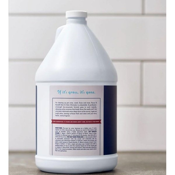 Details: Accidents happen. After all, dogs are only canine. And even the best-behaved cats sometimes think outside the litter box. That’s when it’s up to us, as their true best friends, to have the right product on hand to restore peace, love and carpets. In the case of pet urine and other tough stains and odors, Rocco & Roxie stain & odor eliminator is the one to reach for. Its professional-strength bio-enzymatic formula goes to work at once, releasing active bacteria that feed on ammonia residues left behind in pet urine and other organic materials. So not only does it get out the stain, it eliminates the odor deep down within the carpet at its source-which discourages re-soiling. The result: Stains and odors are completely eliminated, leaving carpets, floors, furniture and other surfaces fresh and your beloved pet. Out of the dog house. Of course, it works on much more than pet urine: any organic stain-vomit, feces, all the gross stuff, whether human or animal-lifts out of rugs, carpets and upholstery easily and completely. And not only is our stain & odor eliminator child, pet, it’s so safe on carpets its earned approval from the trusted carpet and rug institute (CRI). Many of our customers tell us this is the most effective stain and odor product they’ve ever used — in fact, we guarantee it! Not just the stain, but the stink. From stinky yellow pet urine and feces to vomit and other organic spills, our professional strength formula tackles them all.