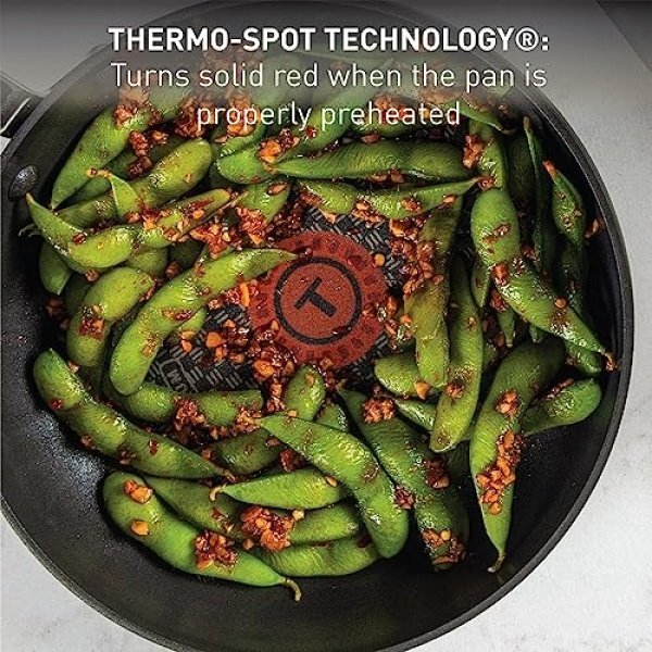 - Thermo-Spot Technology: Unique heat indicator turns solid red when pans are properly preheated so you’ll know exactly when to start cooking for perfect results every time.